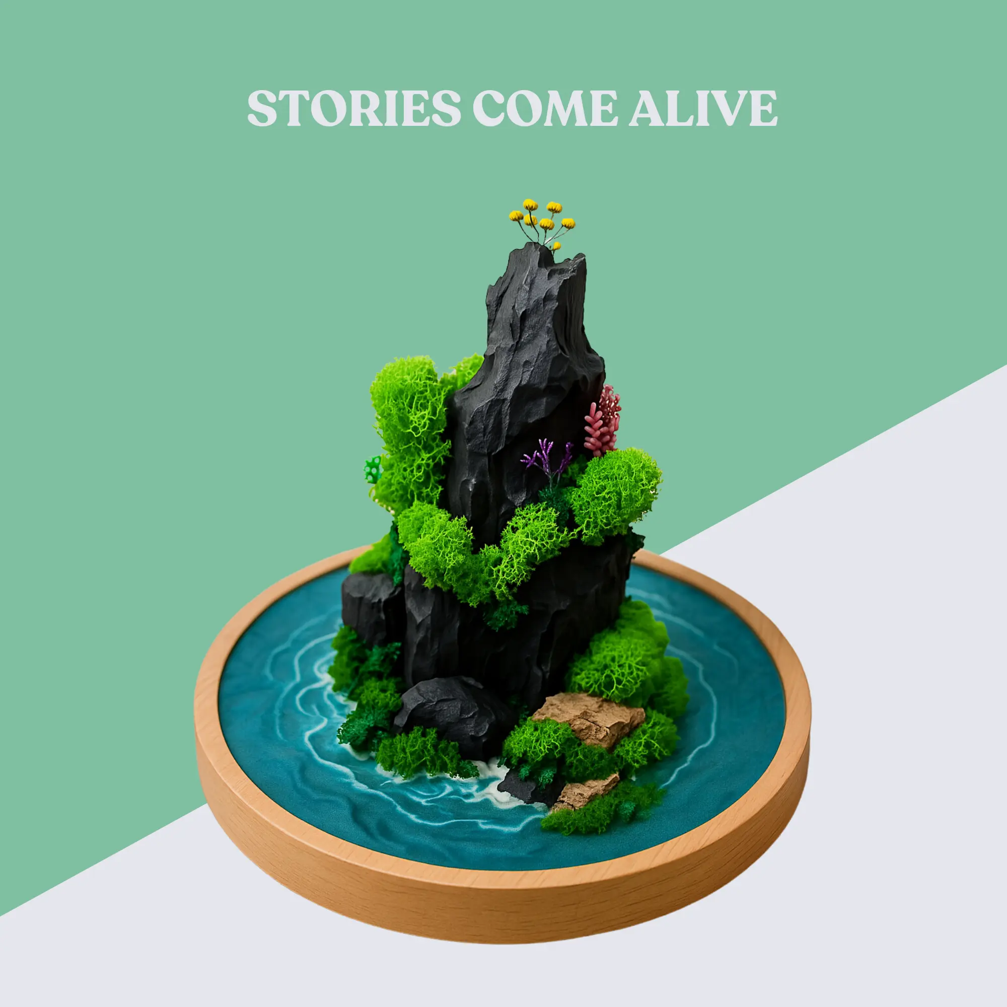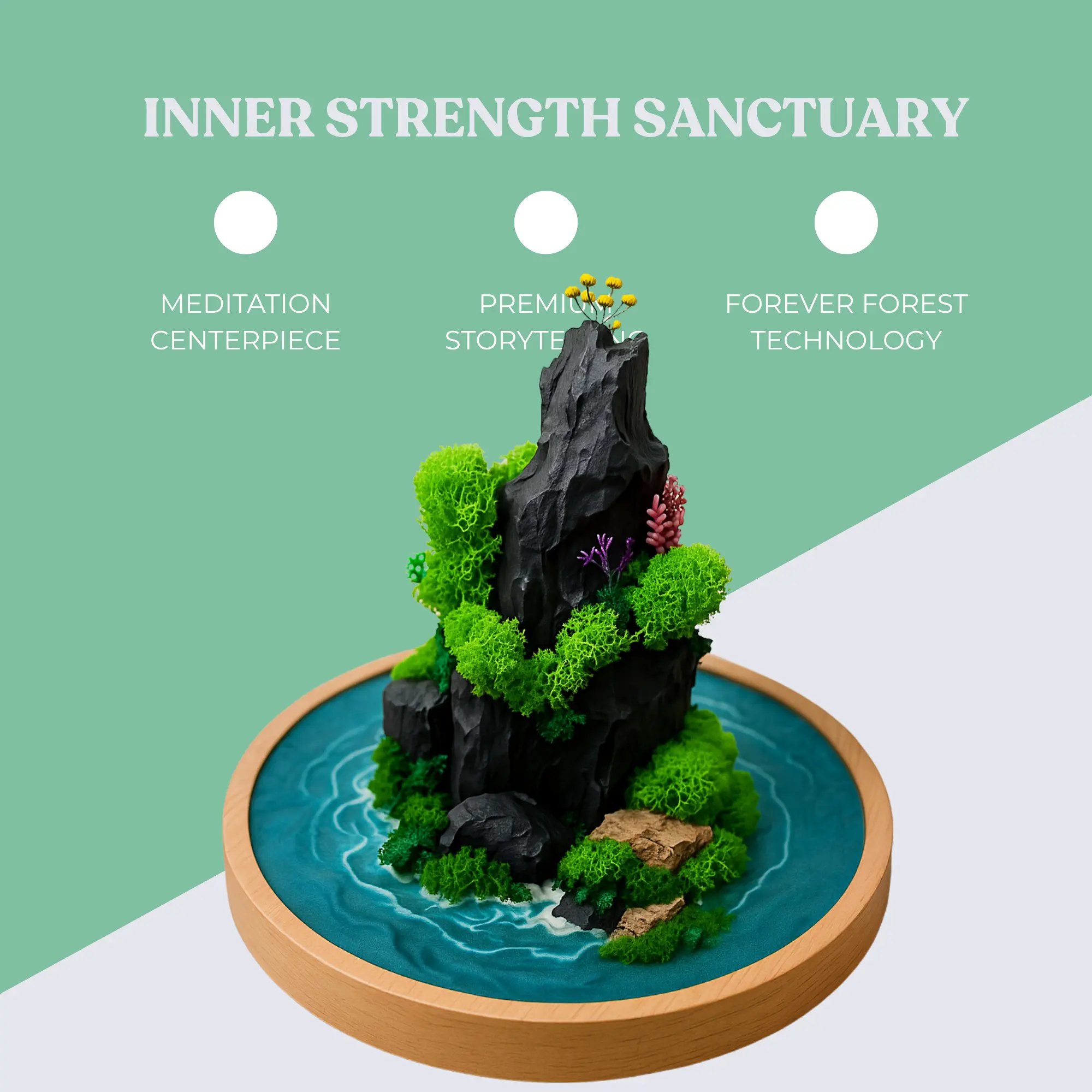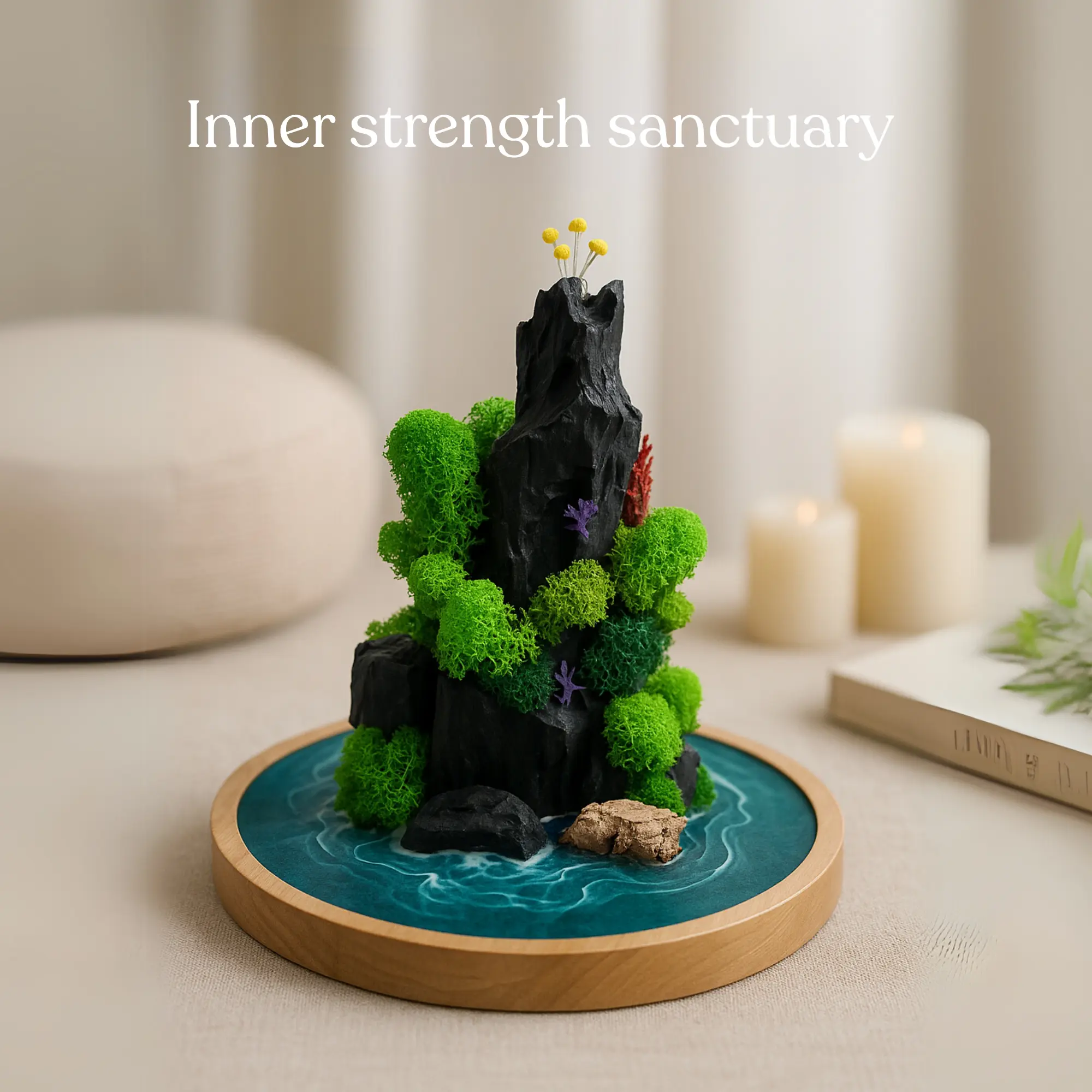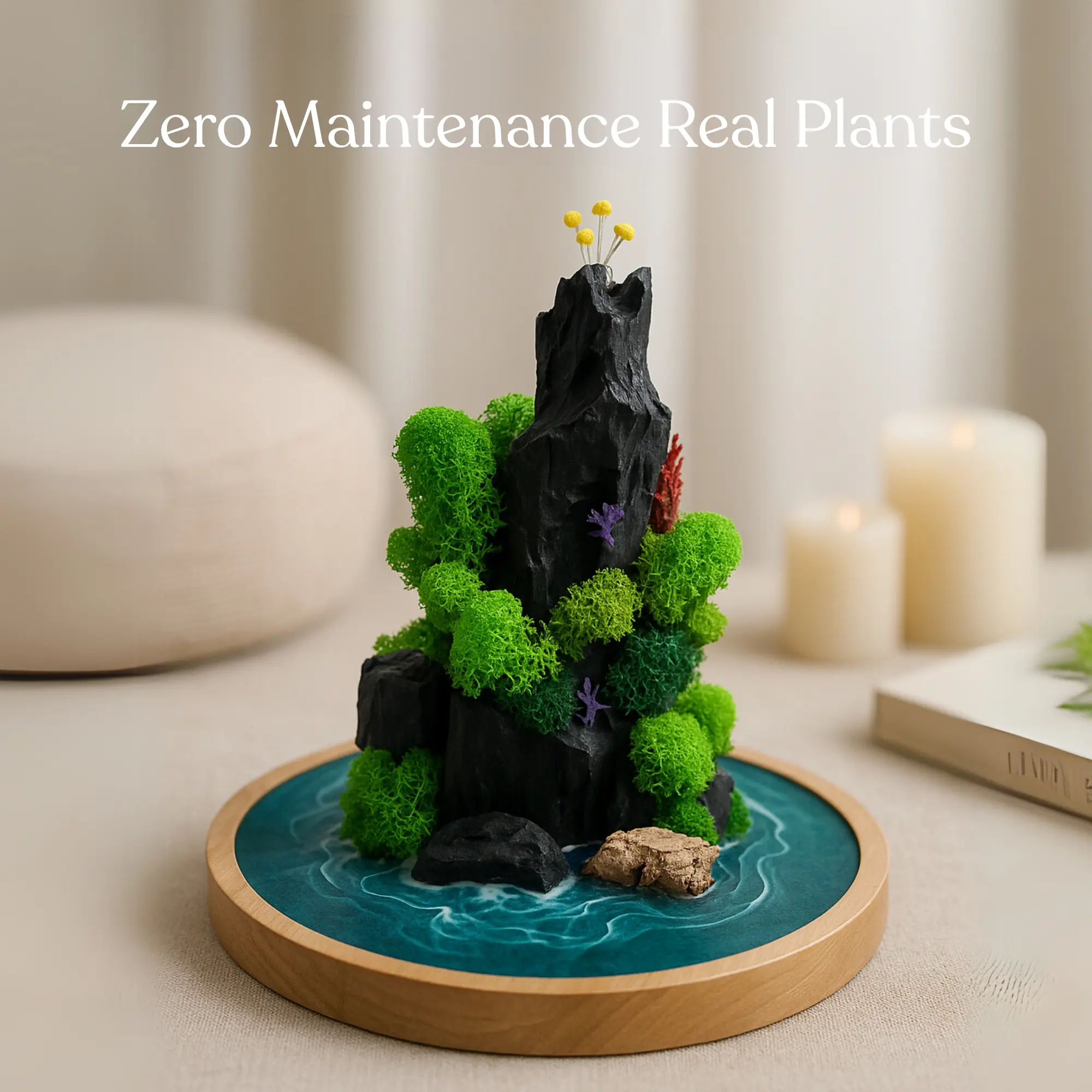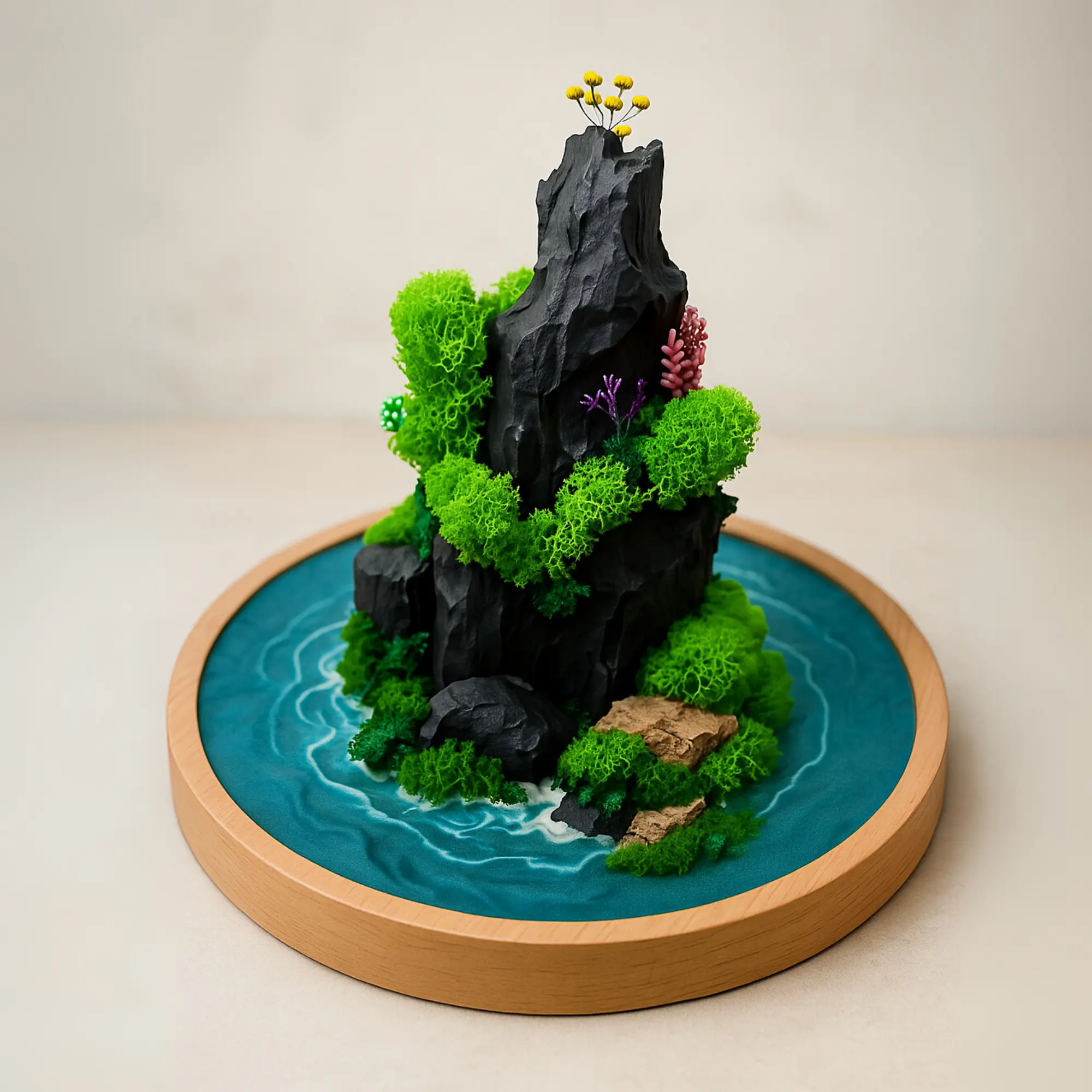 12″ round wooden tray with expansive preserved moss landscape and turquoise resin water art | Large center display. Statement water centerpiece for luxury spaces seeking dramatic landscape beauty with flowing aquatic art and zero maintenance.
