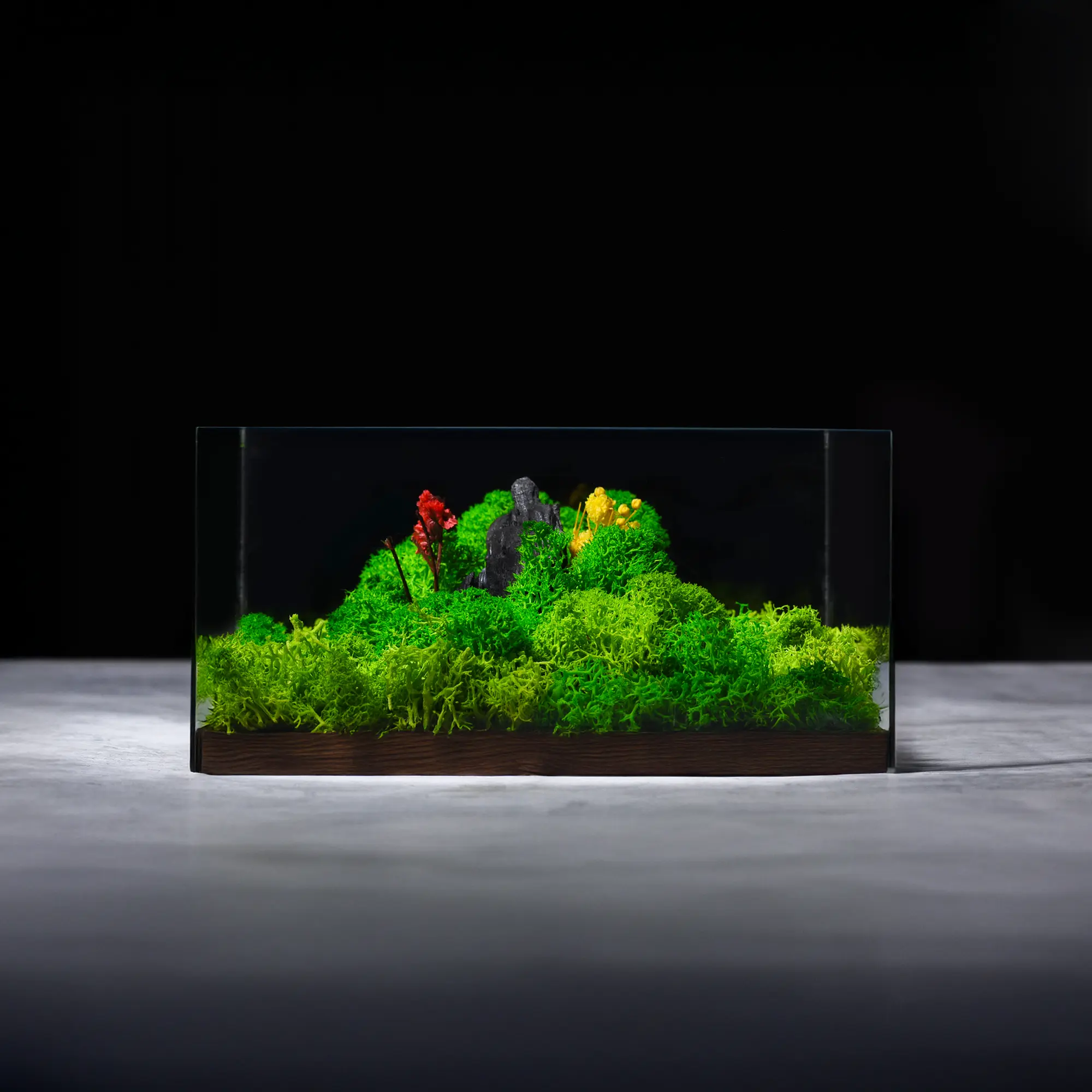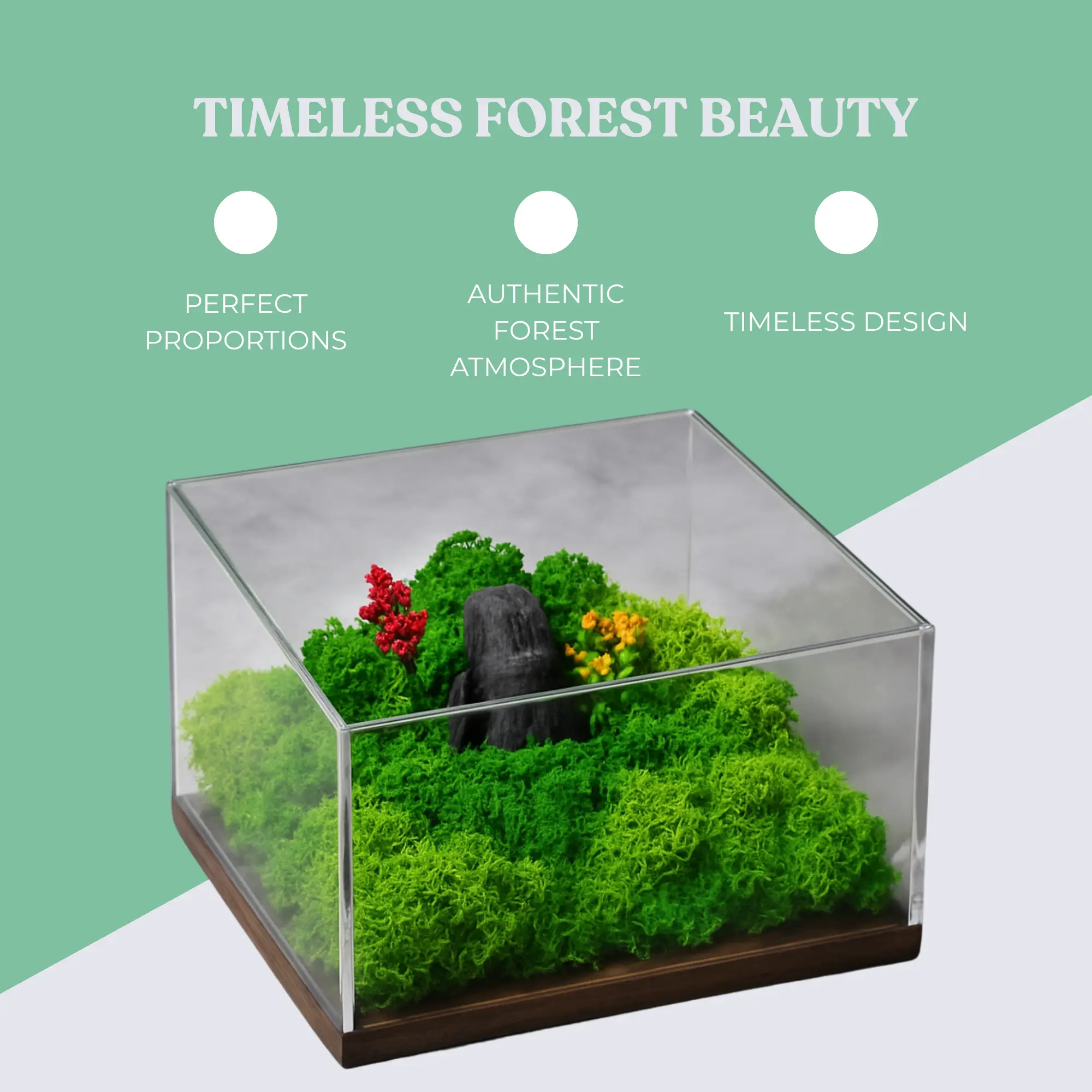6″x 6″x 3″ classic square, preserved moss and flowers, acrylic protective cover, perfect proportions. Ultimate desk companion combining classic proportions with preserved forest authenticity for modern workspaces.