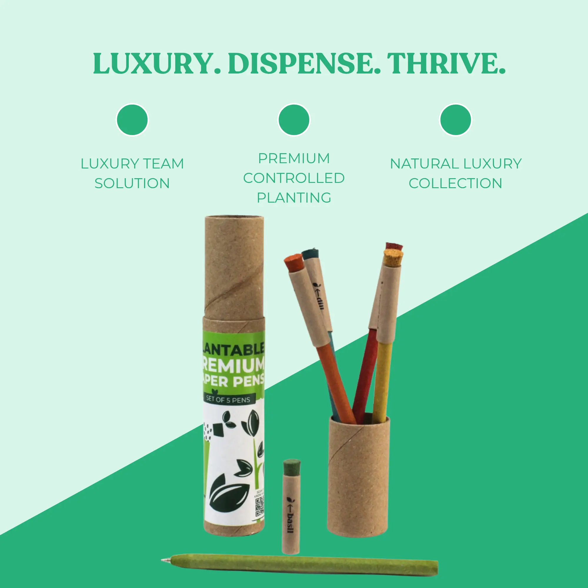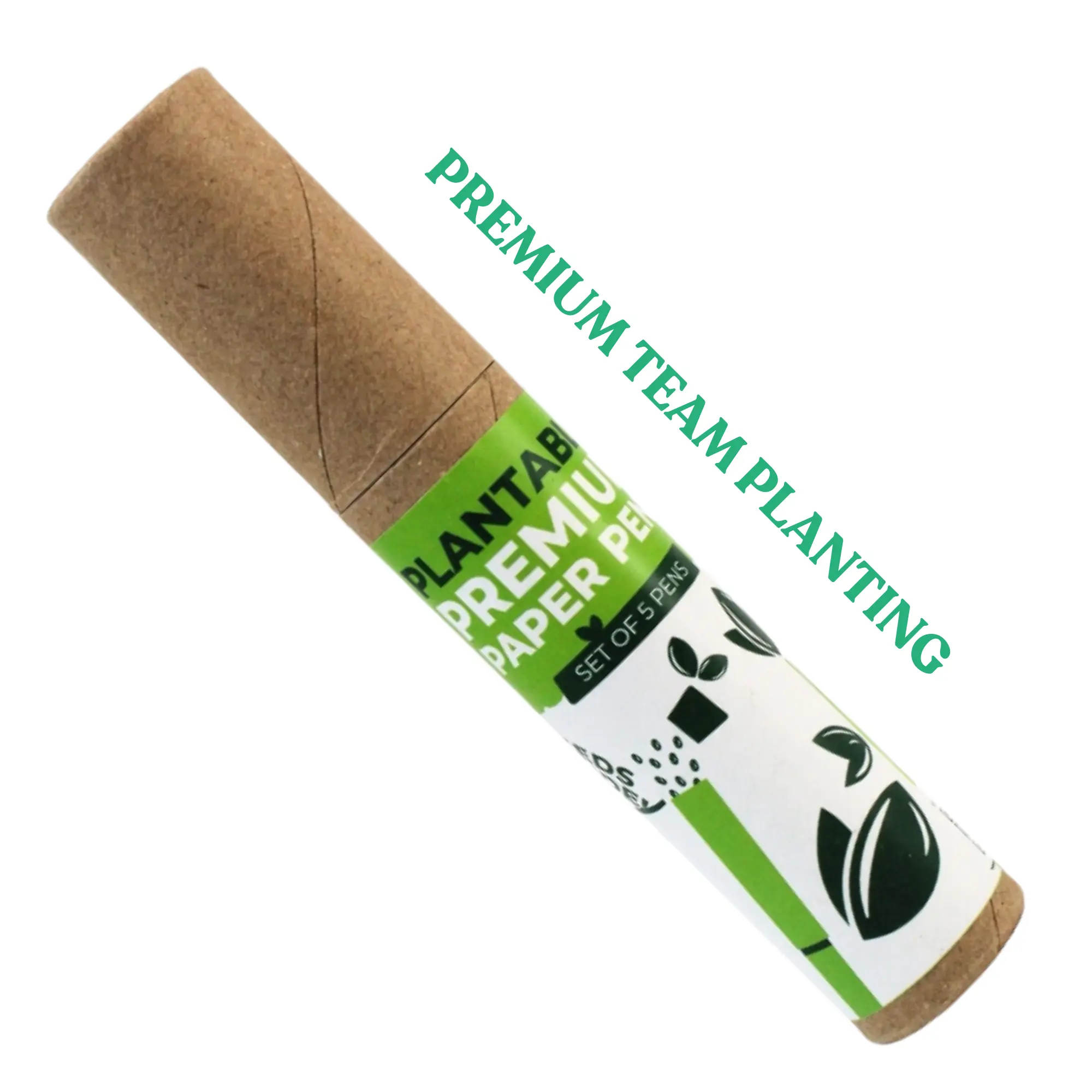 Set of 5 plantable pens, 100% recycled paper body and cap, cork top, recycled paper tube packaging