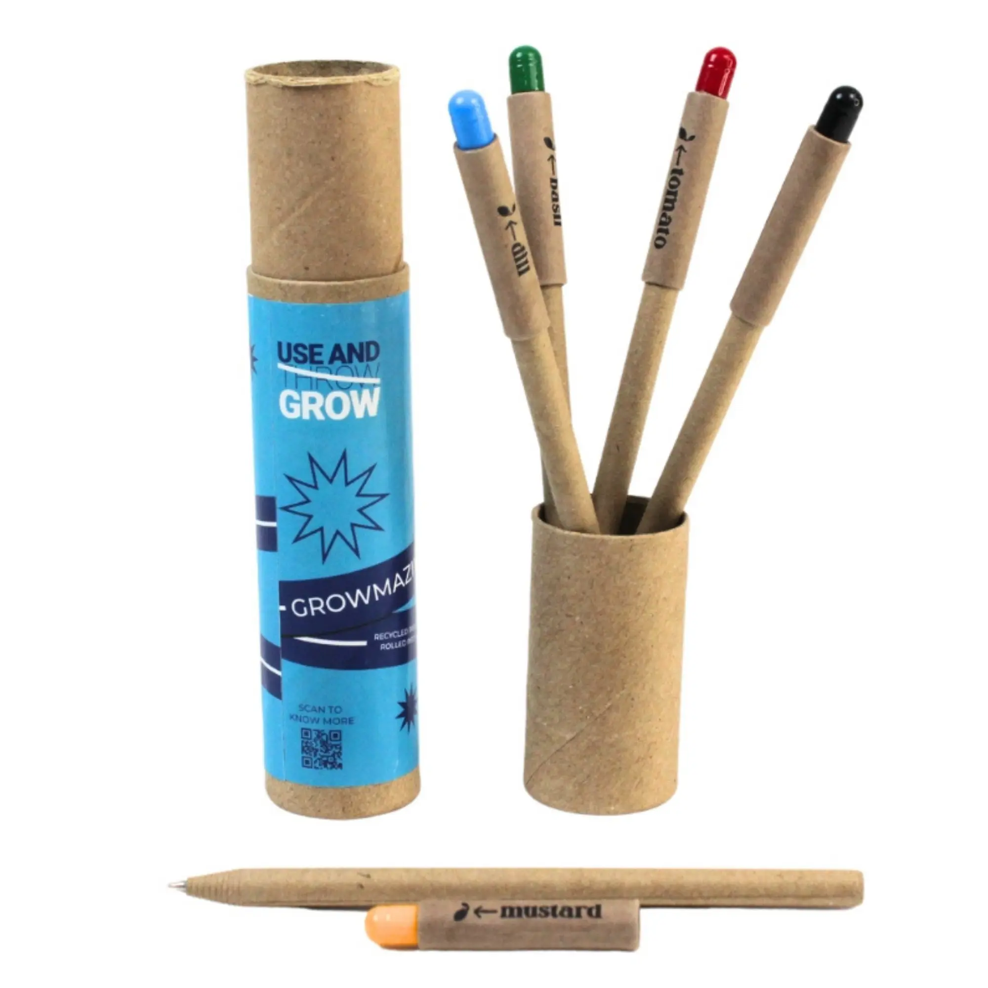 5 plantable pens, 100% recycled paper construction, mixed seed varieties, recycled paper tube packaging