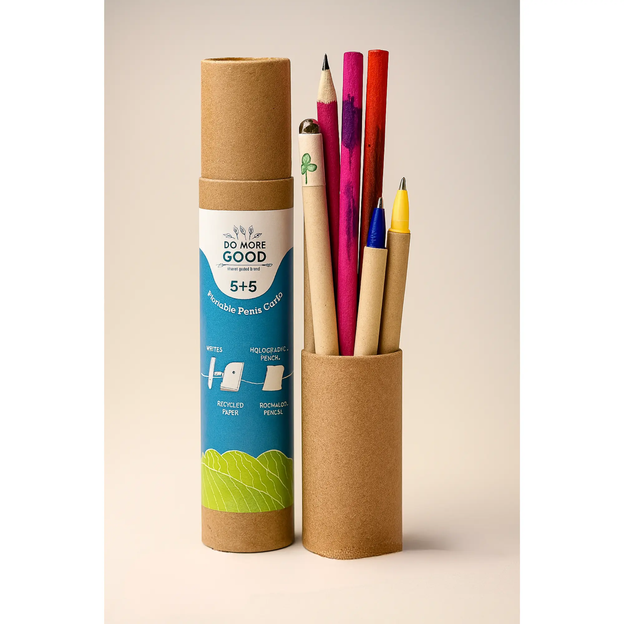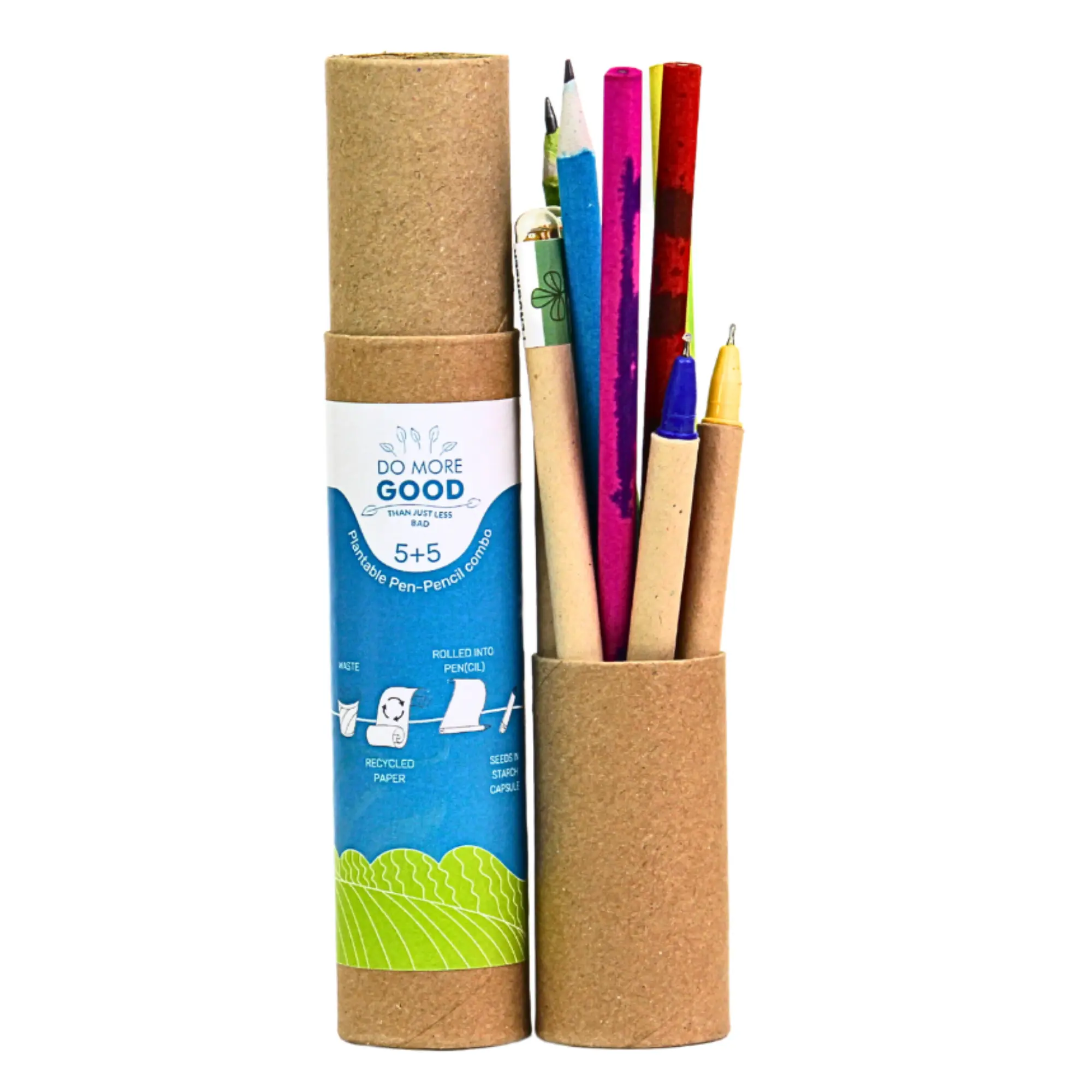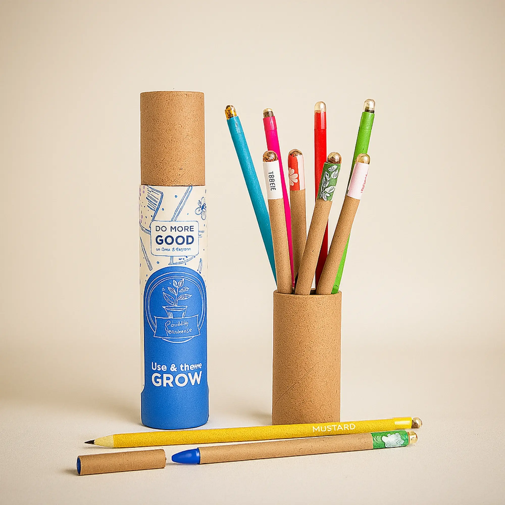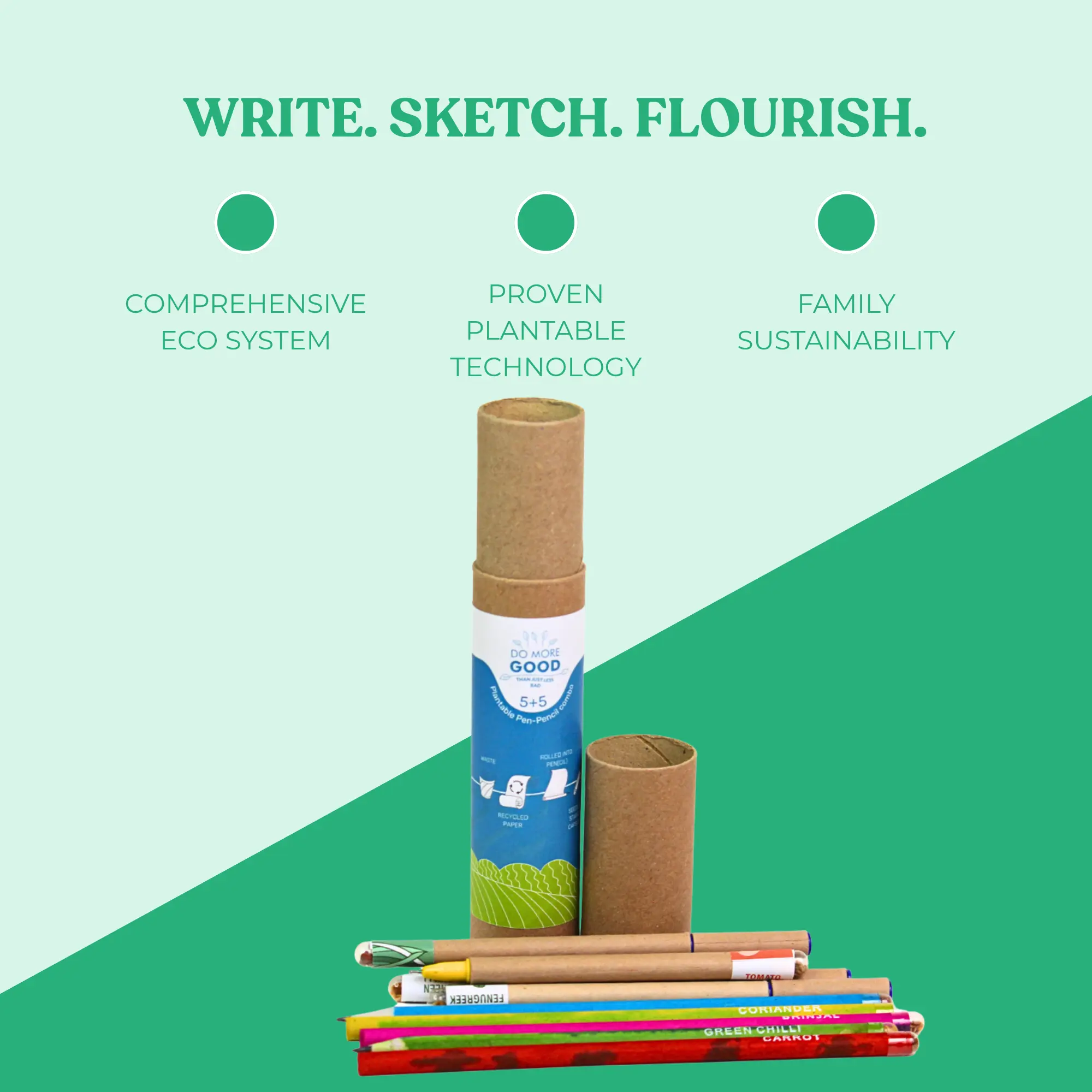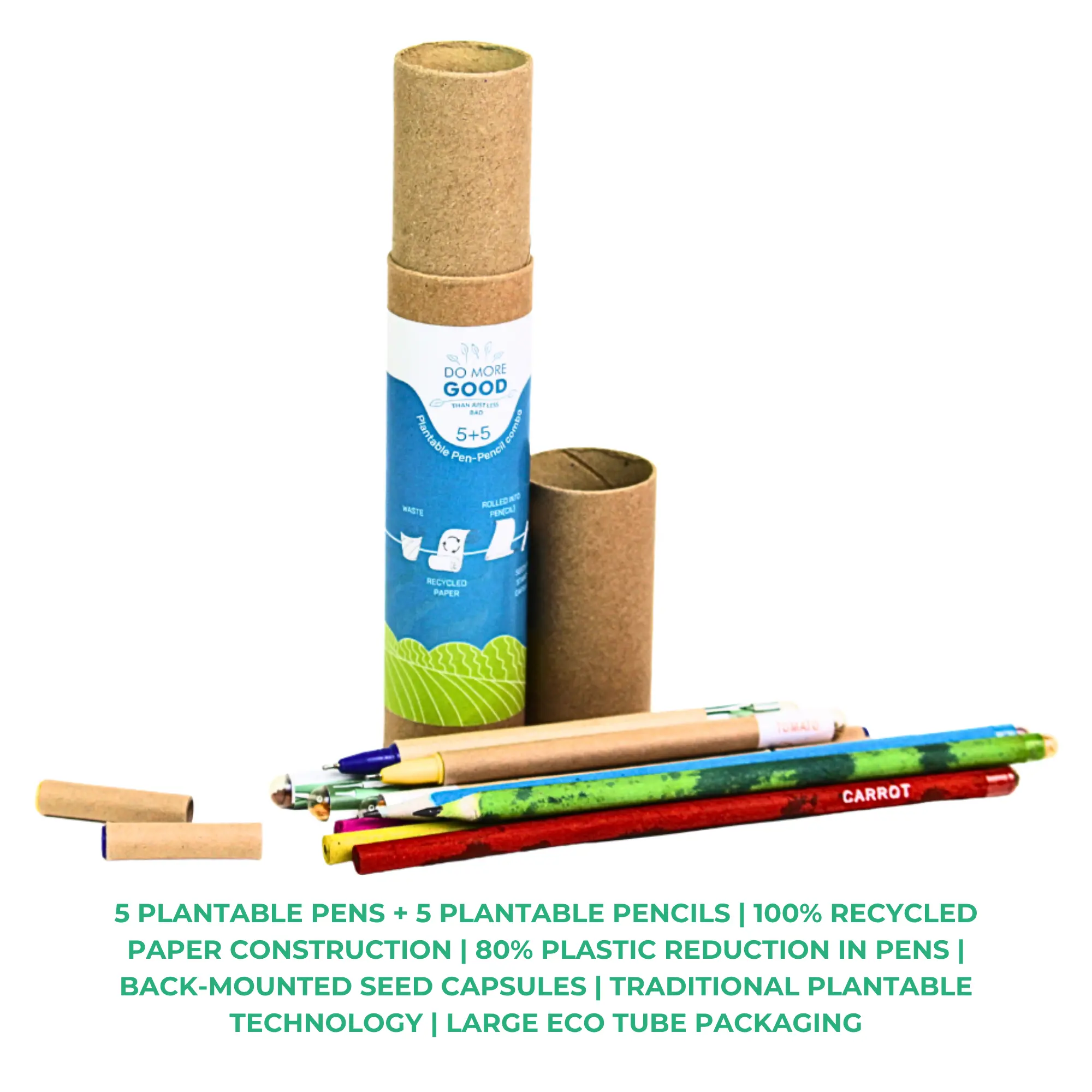 5 pens (5x less plastic) and 5 pencils combo, plantable seed tech, sustainable materials, recycled paper tube packaging