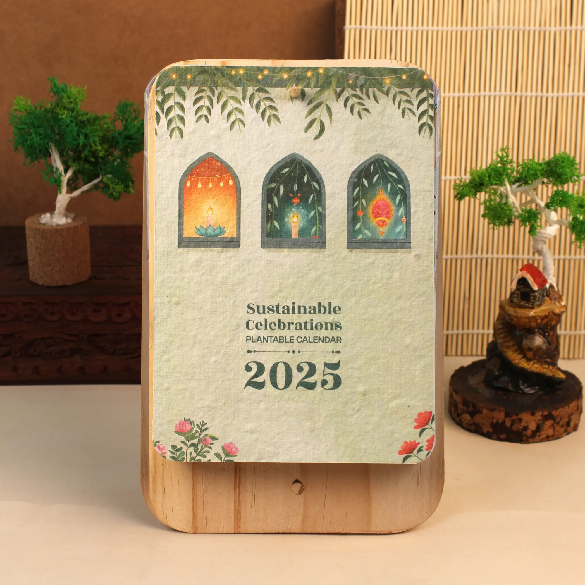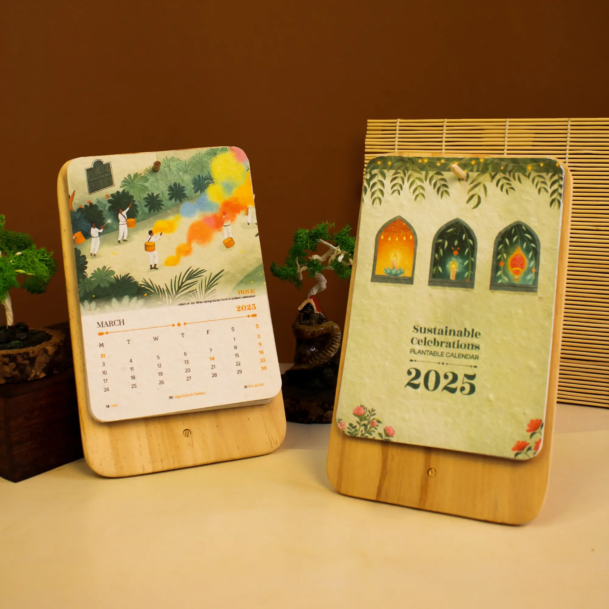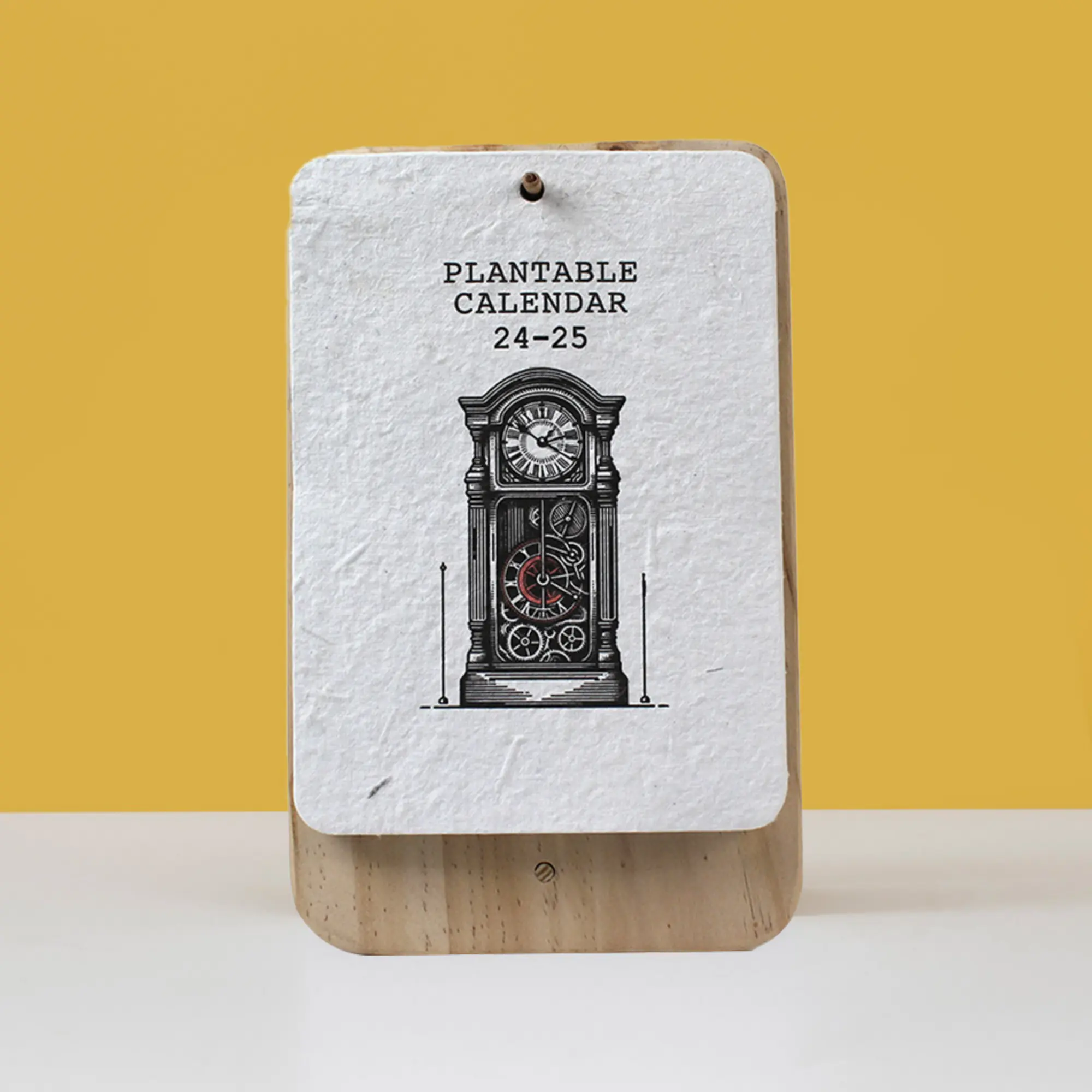 12 seed‑paper sheets (5″×7″); 6″×9″ wooden plate stand w/ rear support & front hook; tomato, basil & marigold seeds. Planting Instructions included. Dual display flexibility: hang or prop this eco‑chic calendar, then plant each sheet to grow a vibrant year-round garden.
